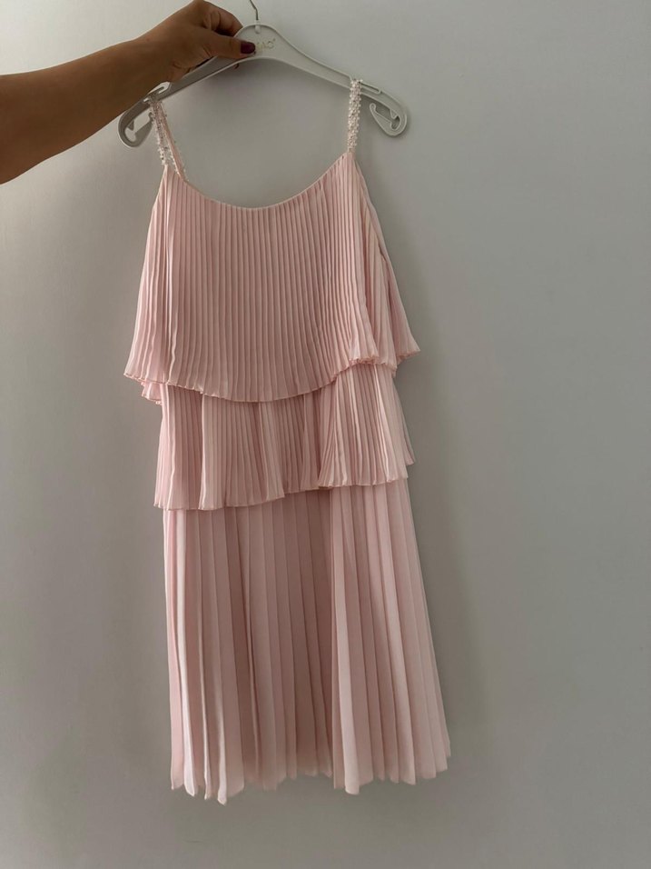 Pembe renkte, pilili katmanlı ve askılı kısa abiye elbisedir. Straplez yakası ve bol kesimiyle modern klasik tarzı yansıtır.