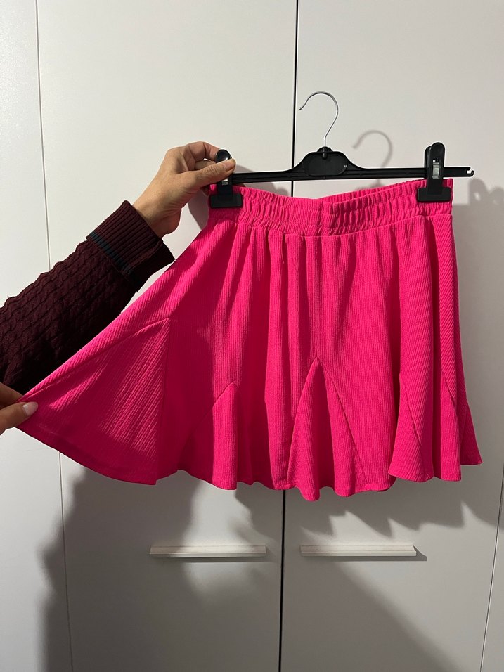 Bu pembe mini etek, pilili tasarımı ve bol kesimiyle yumuşak sentetik kumaştan üretilmiştir. Günlük kullanıma uygun sade ve rahat bir tarza sahiptir.