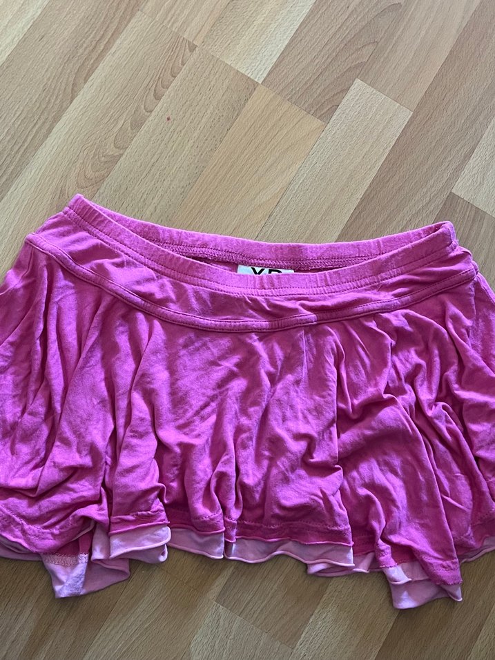 Pembe pilili mini etek, bol kesim ve yumuşak kumaştan yapılmıştır. uzunluk 26-30cm beli 36 cm