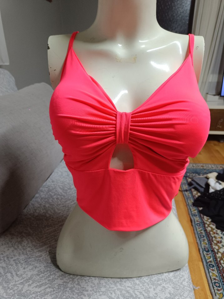 Pembe renkli, V yaka ve pilili tasarıma sahip, sentetik kumaştan üretilmiş dar kesim mini büstiyer. Kolsuz ve kısa boyda, sokak stili partiler için uygun.