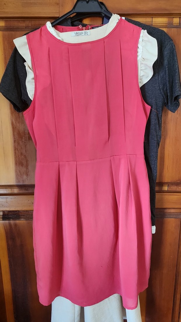 Pembe, pilili ve straplez midi elbise, sentetik kumaştan, ofis kullanımı için uygun.