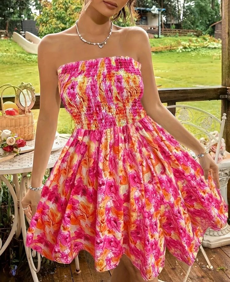 Renkli pembe, pilili, straplez mini elbise, bol kesimli ve yumuşak sentetik kumaştan. Parti için bohem tarzında uygun.