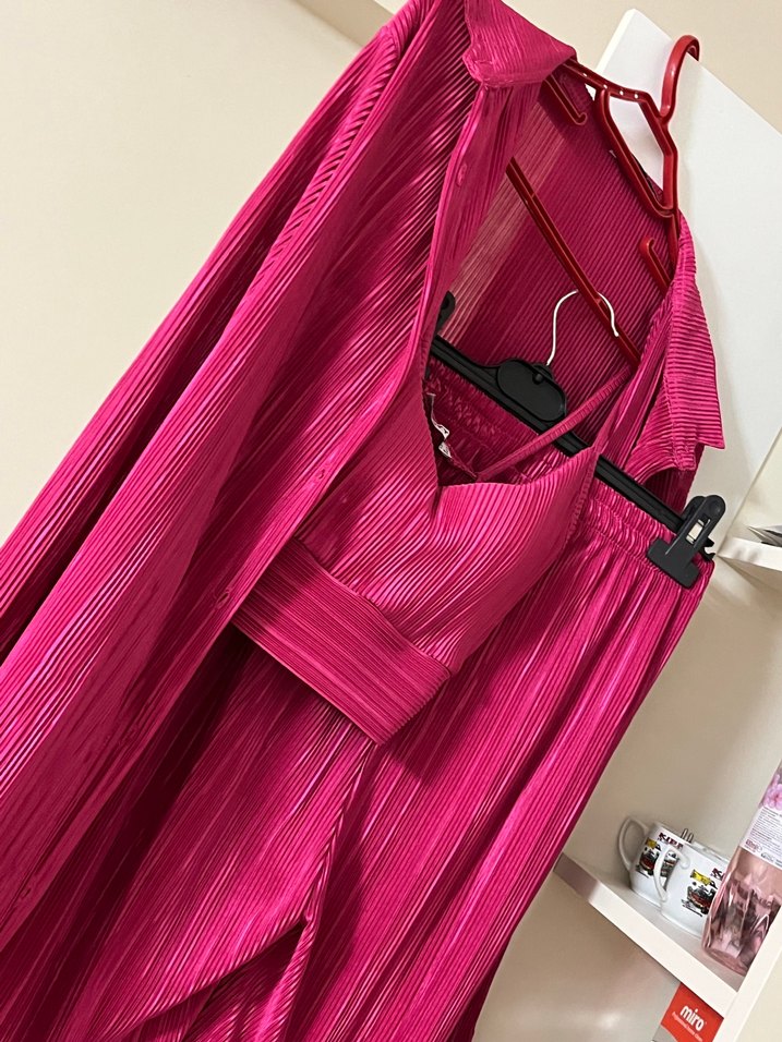 Parlak pembe renkli, pilili ve bol kesim uzun kadın pantolon ve gömlek içinde bustiyeride var Sentetik kumaştan, bağlama desenli, romantik akşamlar için uygundur. Gerçekten çok rahat bir takım üç parçadan oluşuyor 38 beden ama ben 40 42 giydiğim zaman almıştım gömlek ve pantolon bol kesim çünkü sadece ama sadece bir kez kullandım ve 1000 TL’ye aldım