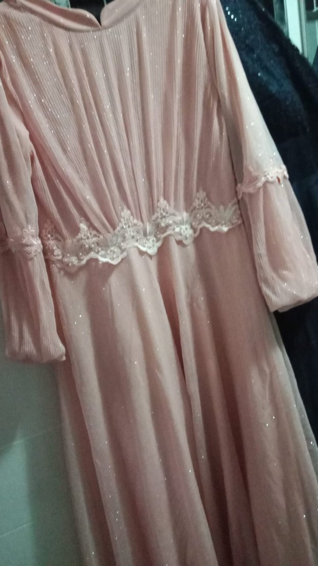 Pembe uzun abiye elbise, pilili ve bol kesimdir. Kayık yaka ve askılı kollara sahiptir. Bel kısmında dantel detay bulunur, düğünler için uygundur. 40-42 beden uyumludur.