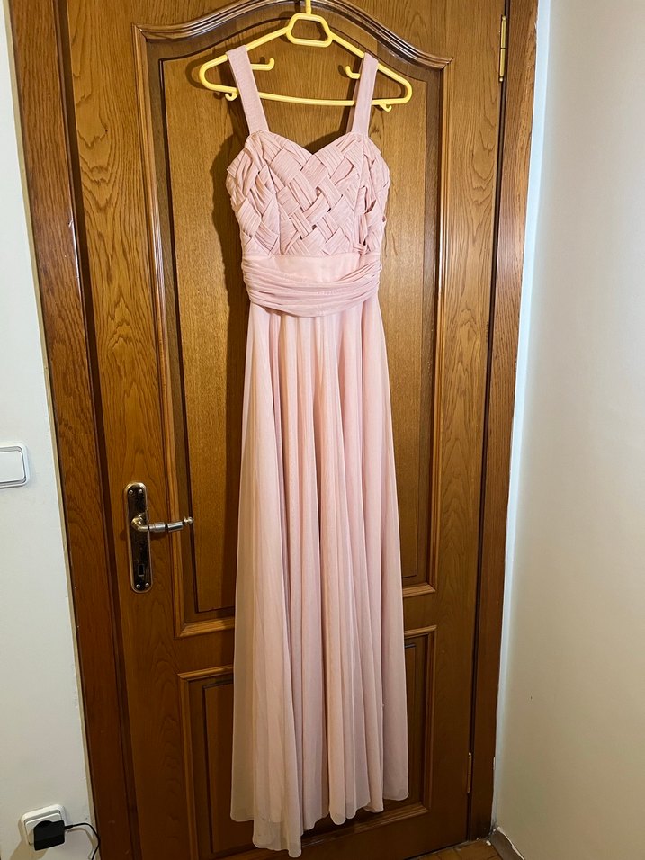 1 KERE GİYİLDİ. Pembe renkte, pilili detaylı ve askılı uzun abiye elbise. Straplez yakalı ve klasik vintage tarzıyla düğünler için uygun. 1 BEDEN