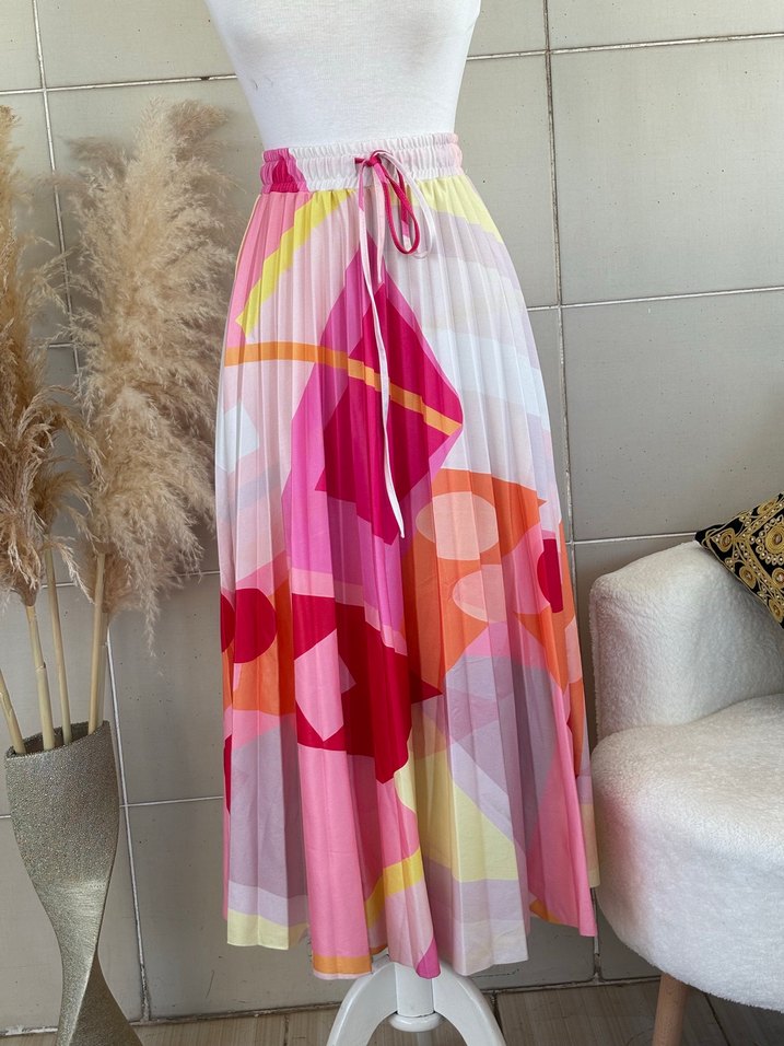 Pembe tonlarda pastel batik desenli pilili uzun etek, bağcıklı bel ve bol kesim ile dış mekan kullanımı için uygundur.