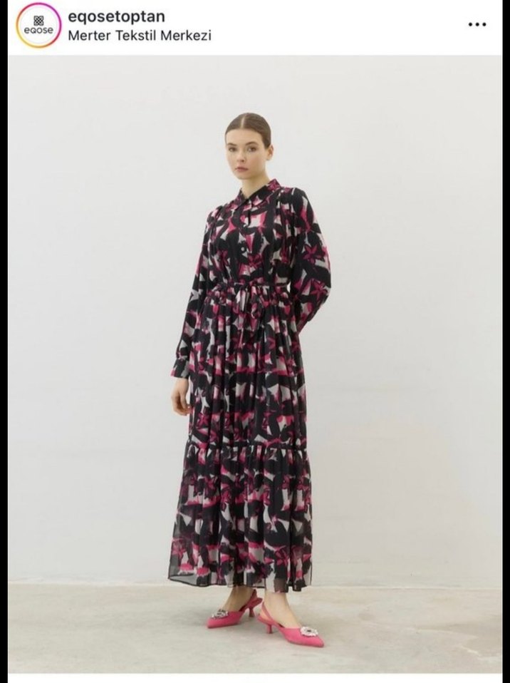 Uzun kollu, yüksek yakalı, bol kesim pilili elbise. Koyu pembe batik desenli, yumuşak sentetik kumaştan üretilmiştir, günlük kullanıma uygundur. bir bedendir 40-44 beden uyumludur