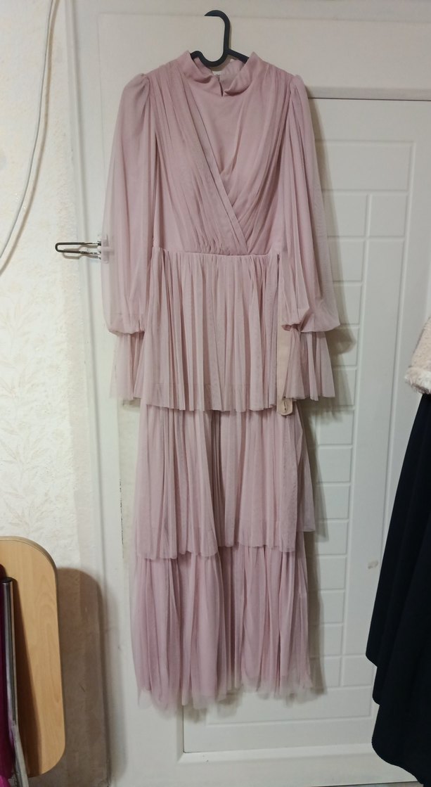 Pastel pembe renkte, V yaka ve ince askılı, pilili katmanlara sahip uzun bohem abiye elbisedir. Bol kesimi ve klasik bohem tarzı ile düğün için uygundur.