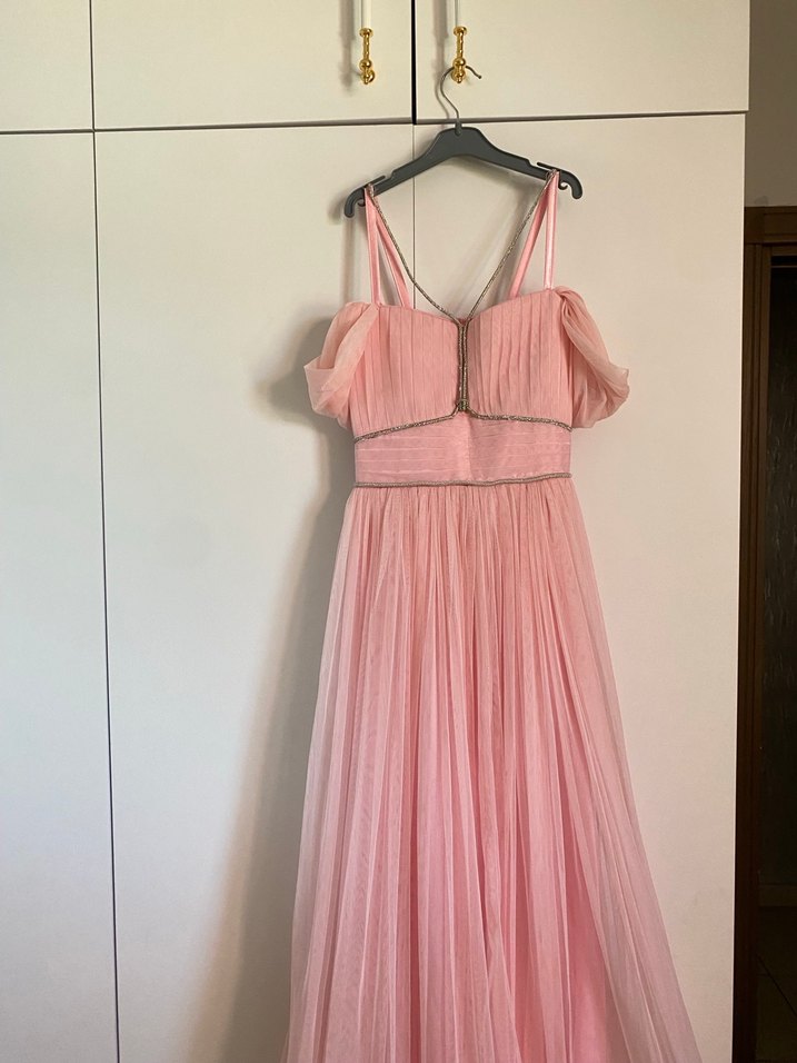 Pembe pilili uzun abiye elbise, ince askılı ve straplez yakalıdır. Bol kesimi ve pastel rengiyle vintage ve modern klasik tarzı bir araya getirir.