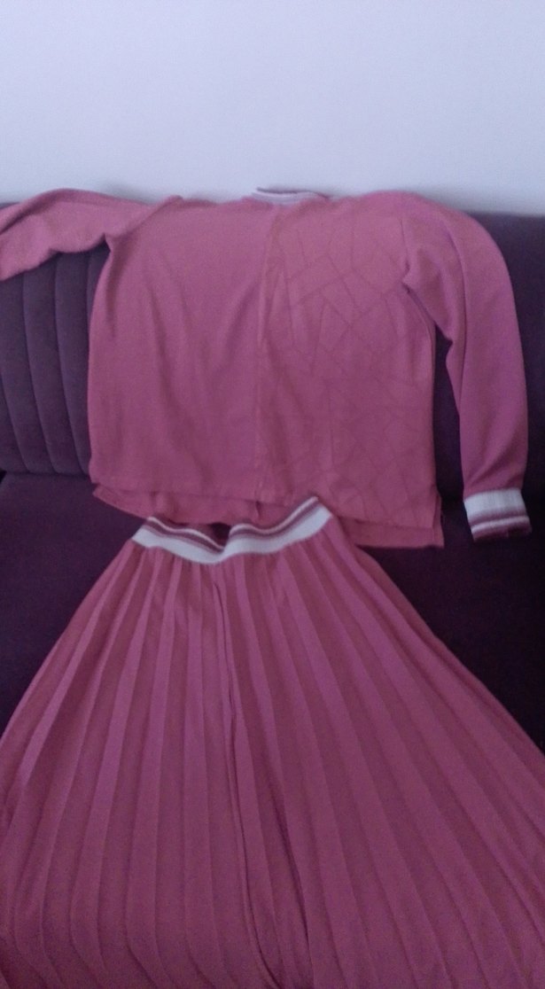Pastel pembe renkte, pilili ve bol kesim hamile eteği. Yumuşak sentetik kumaştan, uzun boylu ve günlük kullanıma uygun.