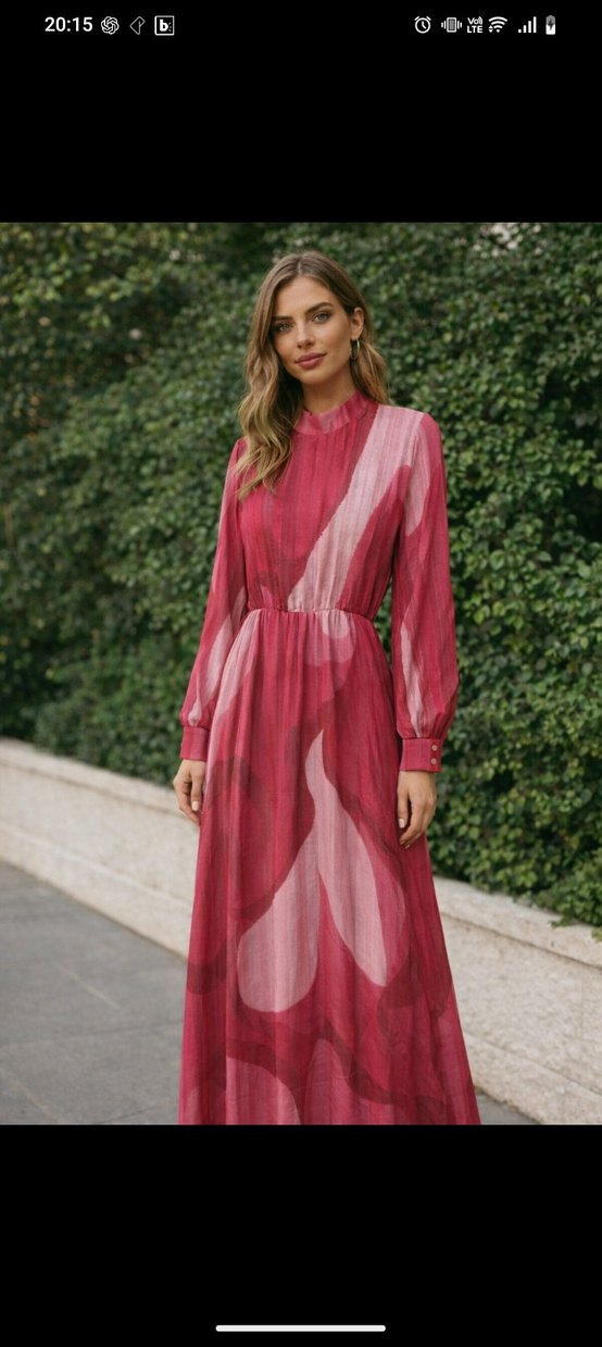 Yüksek yakalı ve uzun kollu, bol kesim kadın elbisesi. Sentetik kumaştan yapılmış, pastel pembe batik desenli ve pilili detaylara sahip, çağdaş tarzda.