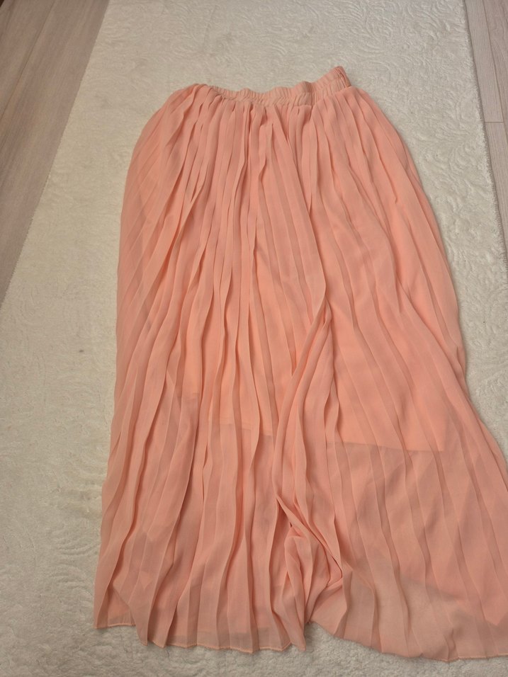 Pembe renkte, pilili ve bol kesim uzun etek. Yumuşak sentetik kumaştan yapılmıştır. Bohem tarzı için uygundur, günlük kullanımda rahatlık sağlar.