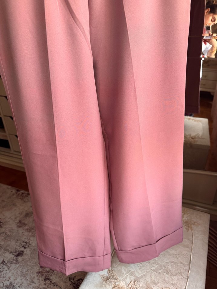 Pembe, pilili ve uzun kesim olan bu kadın kumaş pantolon, klasik zarafeti yansıtan ipeksi kumaştan yapılmıştır.