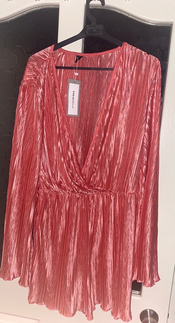 Pembe pilili kumaştan, V yakalı, uzun kollu ve bol kesim uzun abiye elbise. Parlak dokusu ile parti için uygun. ✨ ( yaka kısmı derin şortlu tulum gibi hiç giyilmedi aynı kumaştan kuşağıda var )