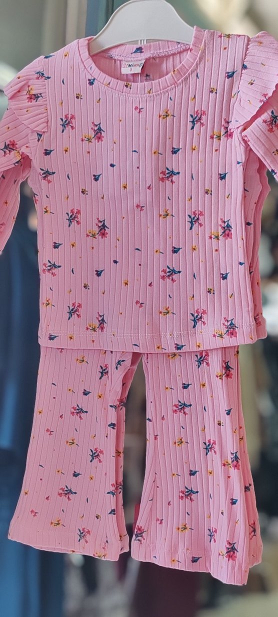 Pastel pembe renkli, pilili ve uzun kollu bebek kız takımı, üzerinde tie-dye desenli küçük çiçekler bulunur. Rahat ve yumuşak kumaştan üretilmiştir.