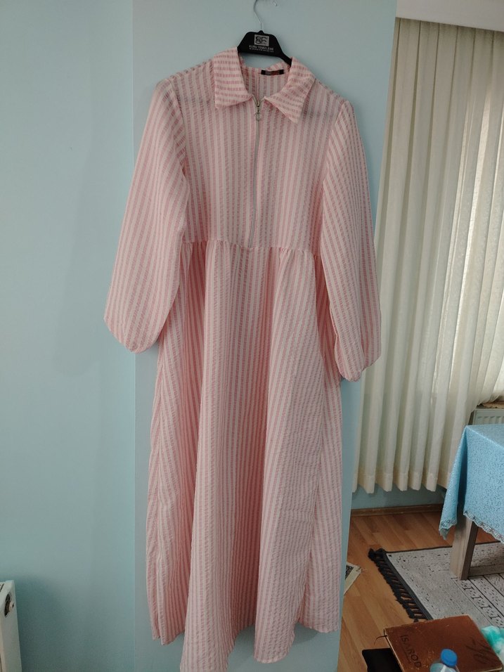Pembe renkte, pilili tasarımlı uzun kollu ve yakalı uzun elbisedir. Rahat kesimi ve yumuşak sentetik kumaşıyla gündelik kullanıma uygundur. So my uyumlu