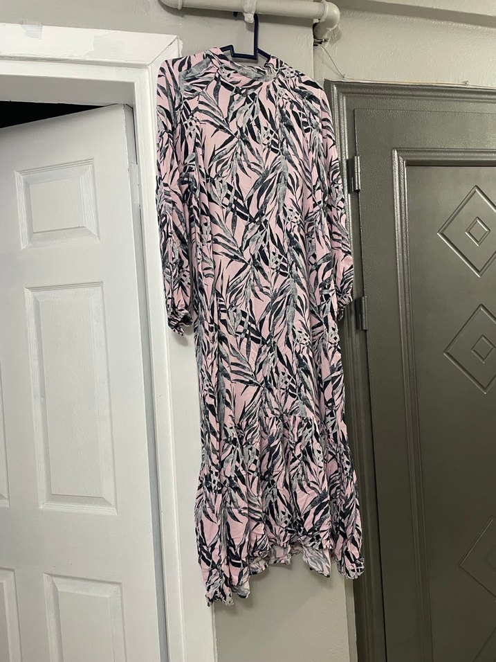 Yüksek yakalı ve uzun kollu, pilili tasarıma sahip uzun, salaş kesim elbise. Pastel pembe tie-dye desenlidir, trend sokak stili için uygundur. Ön ile arkası arasında üç santimlik falan fark var önü kısa arkası uzun. Önü omuzdan 122 santim, arkası omuzdan 125 santim. Hiçbir kusuru yok fakat önünde sarı bir leke var çıkarmayı denemedim