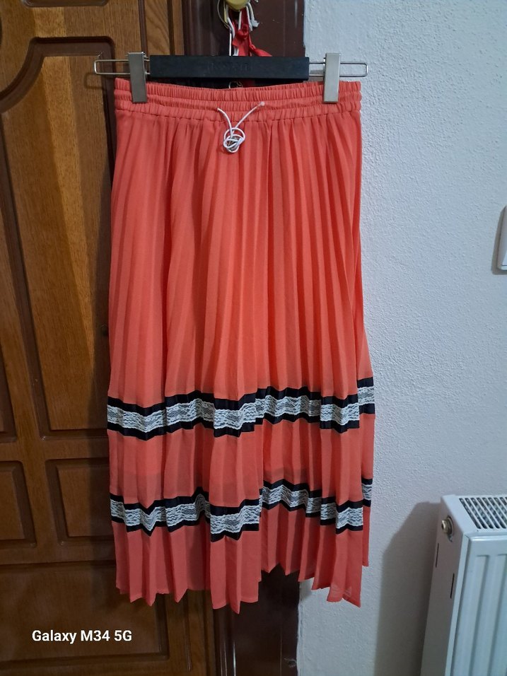 Pembe renginde, pilili ve salaş kesime sahip uzun etek. Sentetik kumaştan üretilmiş, bohem ve retro tarzına uygun günlük kullanıma ideal. defosu önündeki lastigi
