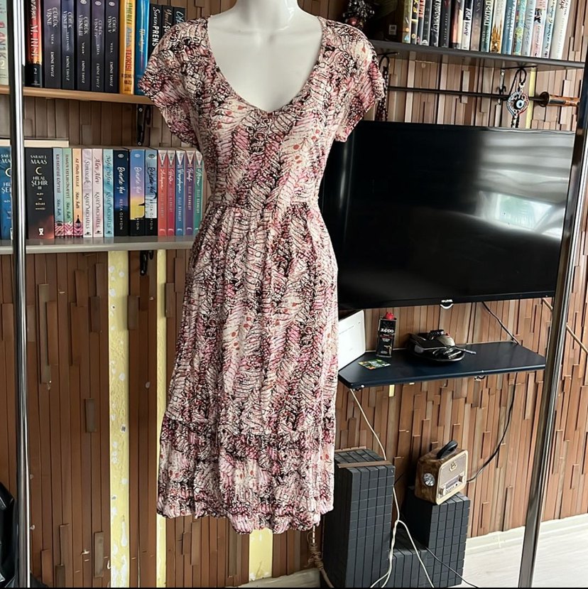 Pembe pastel tonlarda, pilili ve V yakalı, kısa kollu uzun ve bol kesim bohem elbise. Yumuşak kumaştan günlük kullanıma uygun. Kapanan mağazamızdan. M-L-XL-XXL