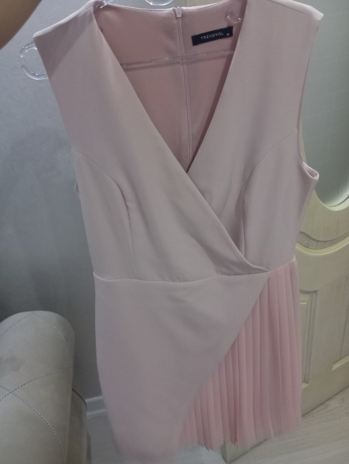 Pembe pastel renkli, kolsuz, V yakalı ve pilili detaylara sahip midi boy elbise, düzenli kesim ve çağdaş tarz sunar, düğünler için uygundur.