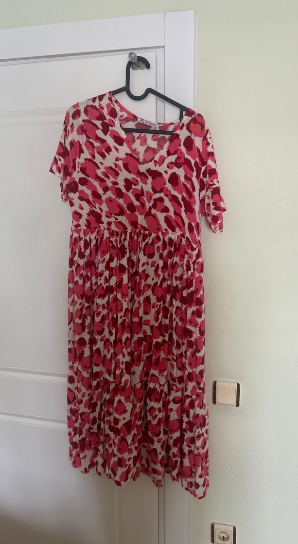 Pembe tie-dye desenli, piliseli ve bol kesim uzun hamile elbisesi. Kısa kollu ve V yakalı, yumuşak sentetik kumaştan günlük kullanıma uygun.