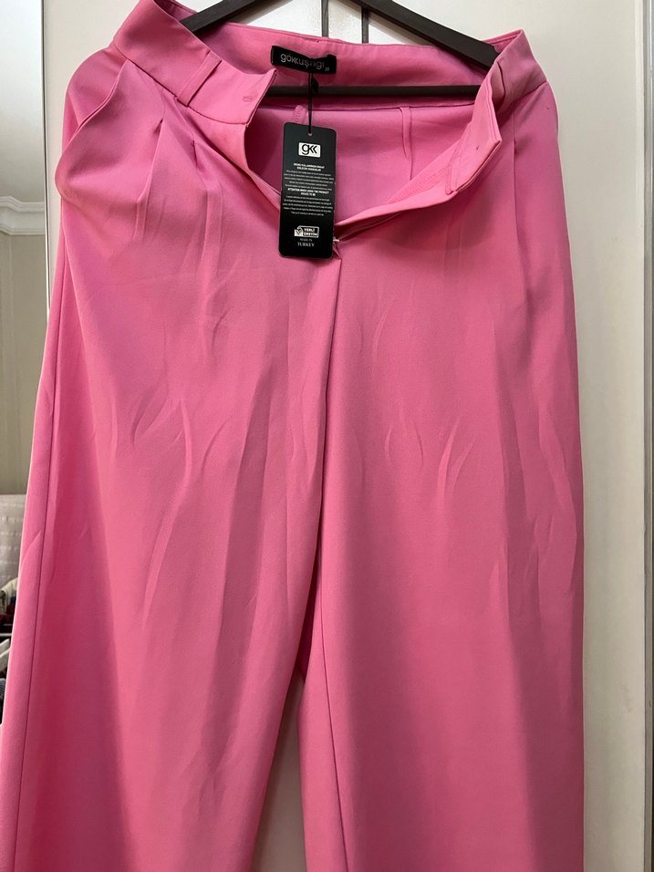 Pembe parlak renkte, piliseli detaylara sahip bol kesim kadın midi kumaş pantolon. Ofis kullanımı için şık ve rahat bir seçim. ✨