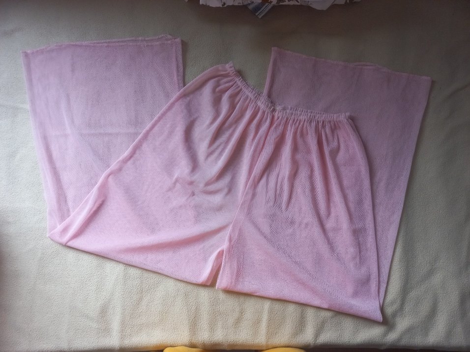 Yumuşak sentetik kumaştan, piliseli detaylı, bol kesim pembe uzun pantolon. Plaj pantolonu.
