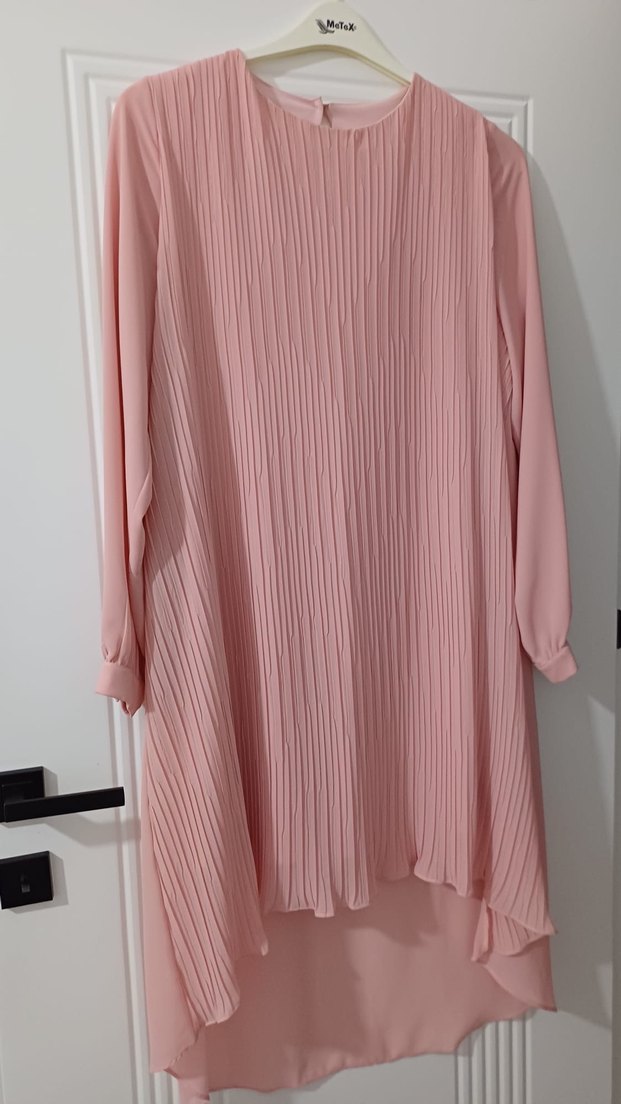 Pembe pastel renkte, uzun kollu, yüksek yakalı ve piliseli detaylı bol kesim uzun kadın tunik. Günlük kullanıma uygun yumuşak sentetik kumaştan yapılmıştır.
