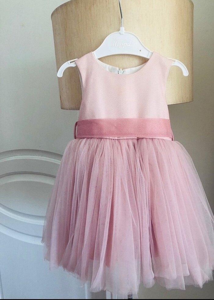 9-12 ay. Toz pembe, kolsuz, tek renk kız çocuk elbisesi. Tekne yaka, piliseli etek ve düz kemer detayıyla modern klasik tarzda, yumuşak sentetik kumaştan. ***Fermuarı bir tık zor kapanıyor gibi sadece***