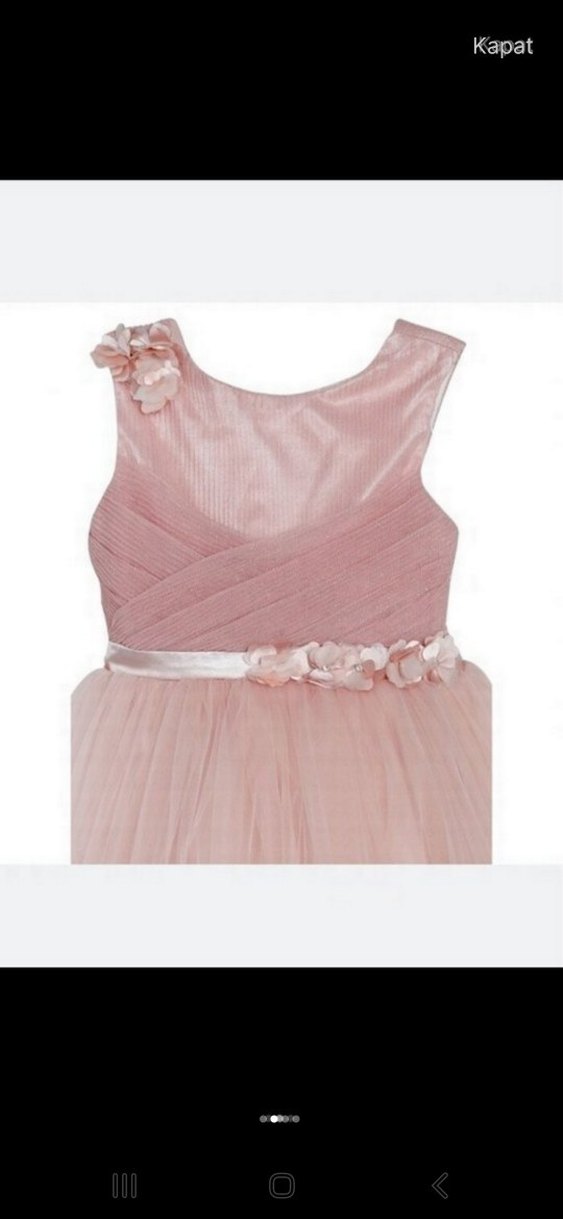 Bu pembe kolsuz elbise, V yaka ve piliseli detaylara sahiptir. Omuz ve bel kısmında çiçek süslemeleri bulunur, modern klasik stilde ve yumuşak pastel renktedir. 9 10 yaş uyumludur.