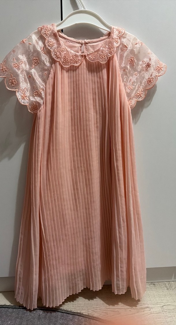 Pembe pastel renkte, yüksek yakalı, kısa nakışlı kollu ve piliseli detaylı, bol kesim kız elbisesi. Modern klasik tarzda tasarlanmıştır. Koton marka 7 yaş