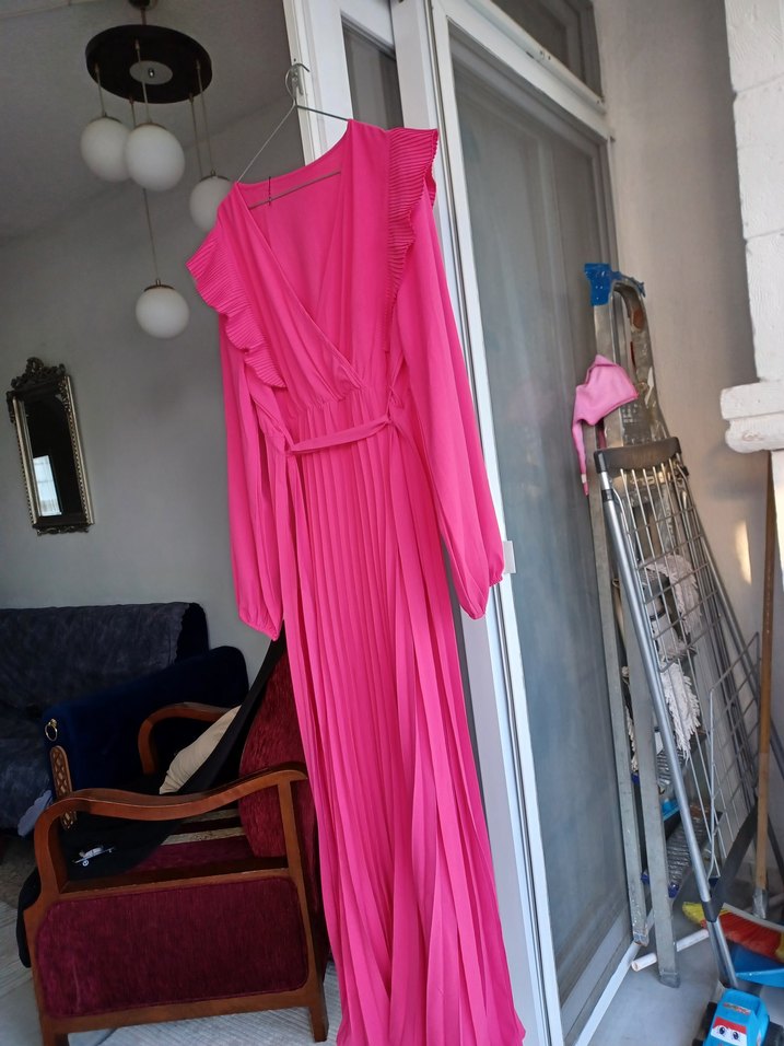 Pembe renkli, piliseli ve askısız yakalı, bol kesim uzun elbise. Pürüzsüz sentetik kumaştan, günlük kullanıma uygun çağdaş Paris tarzı.