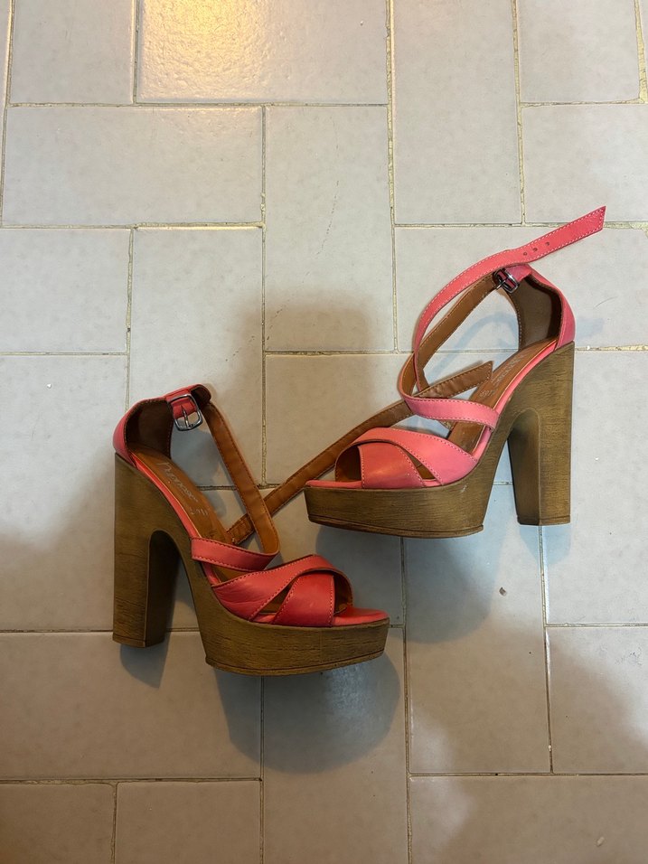 Pembe renkli, ahşap platform topuklu ayakkabı. Renkli baskılı bantları ve tokalı kapanışıyla günlük kullanıma uygun. Etiketi üzerinde 36 numara