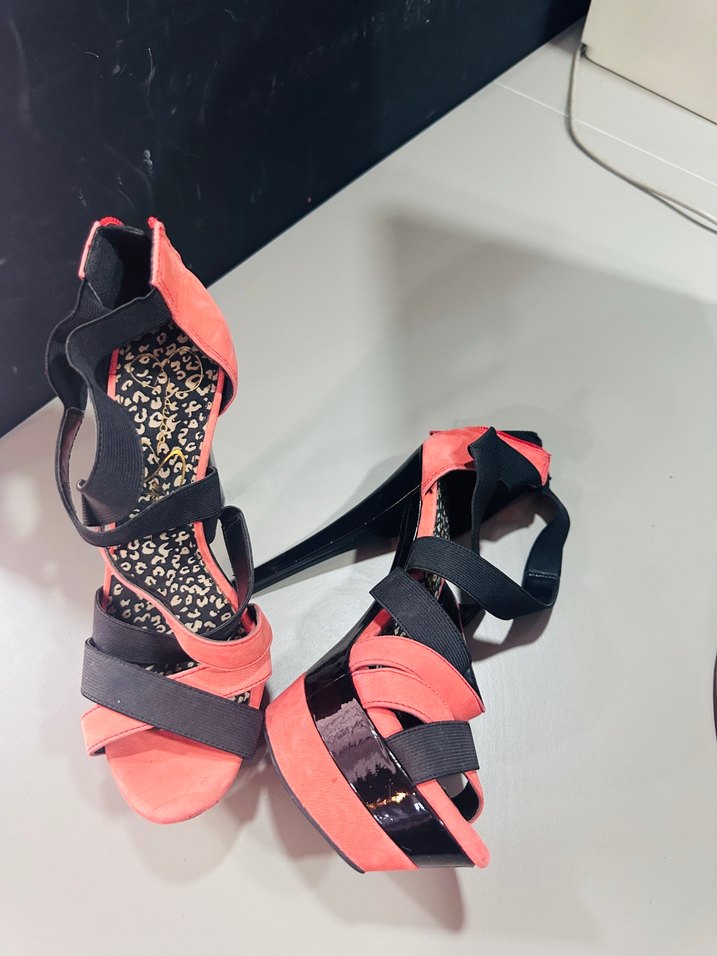 Pembe platform topuklu, tokalı bantlı ve desenli tabanlı kadın abiye ayakkabı. Canlı ve çağdaş tarzda, romantik akşamlar için ideal.