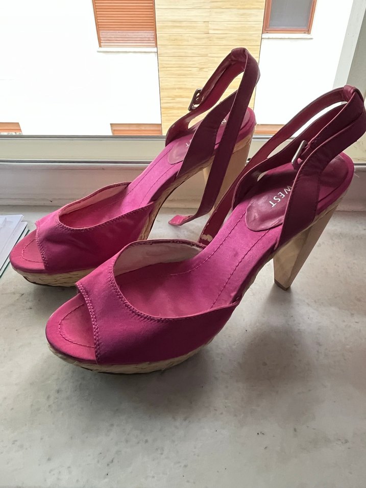 Parlak pembe saten kumaştan, platform topuklu ve tokalı kadın ayakkabı Cok dengeli, uzerinde kosabilirsiniz rahatlikla ki topukluya aliskin olmayan biri olarak soyluyorum bunu. Rahatlar, kesin bilgi. Cok az giyildi ancak durmaktan bilek bandinin ic kisminda dokulme olmus. Onlari boyle seven varsa gelsin diyerek…