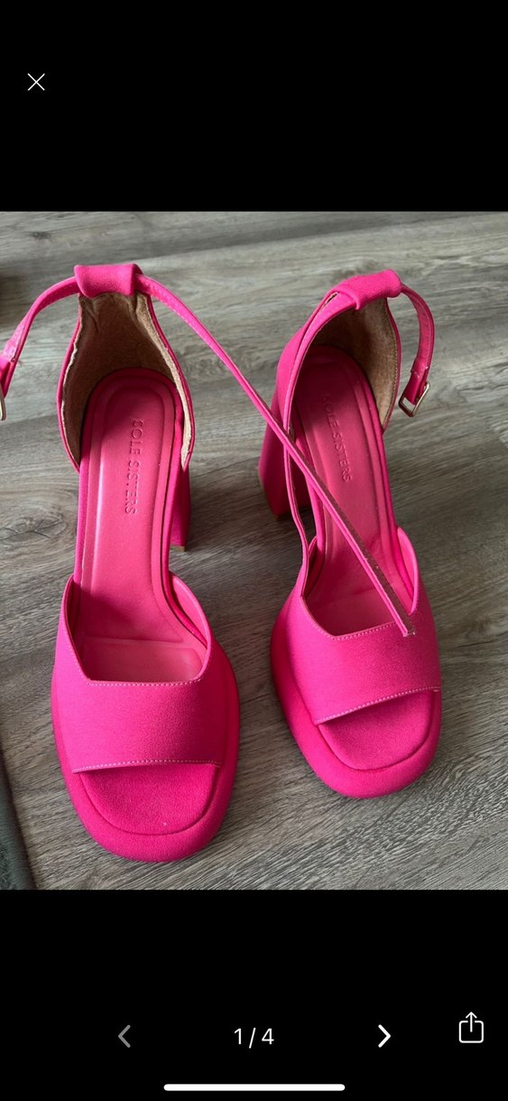 Pembe platform topuklu ayakkabılar, tokalı kayış ve minimalist tasarıma sahip, kauçuk malzemeden üretilmiştir. Romantik gece için cesur bir tarz sunar.
