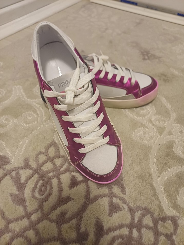 Pembe platform topuklu kadın spor ayakkabısı, pastel batik desenli ve fırfırlı detaylara sahip, kauçuk malzemeden üretilmiştir. yanlizca 1 defa kullanildi
