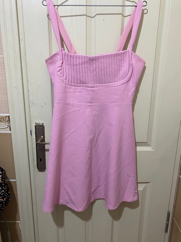 Pembe askılı midi elbise, bust kısmında pliseli detaylara sahip. Düz, sentetik kumaştan, minimalist ve sokak tarzına uygun, günlük kullanıma ideal.