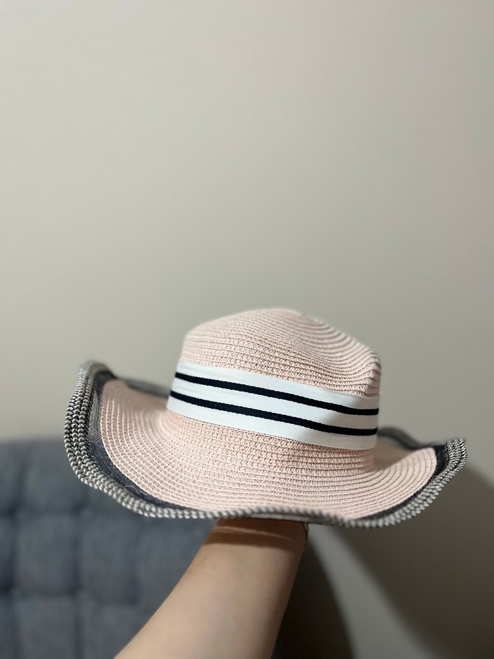 Pembe pastel tonlarda, pliseli triko dokusuyla, çizgili bant ve hafif dalgalı kenarı olan bohem Paris tarzı kadın şapkası.