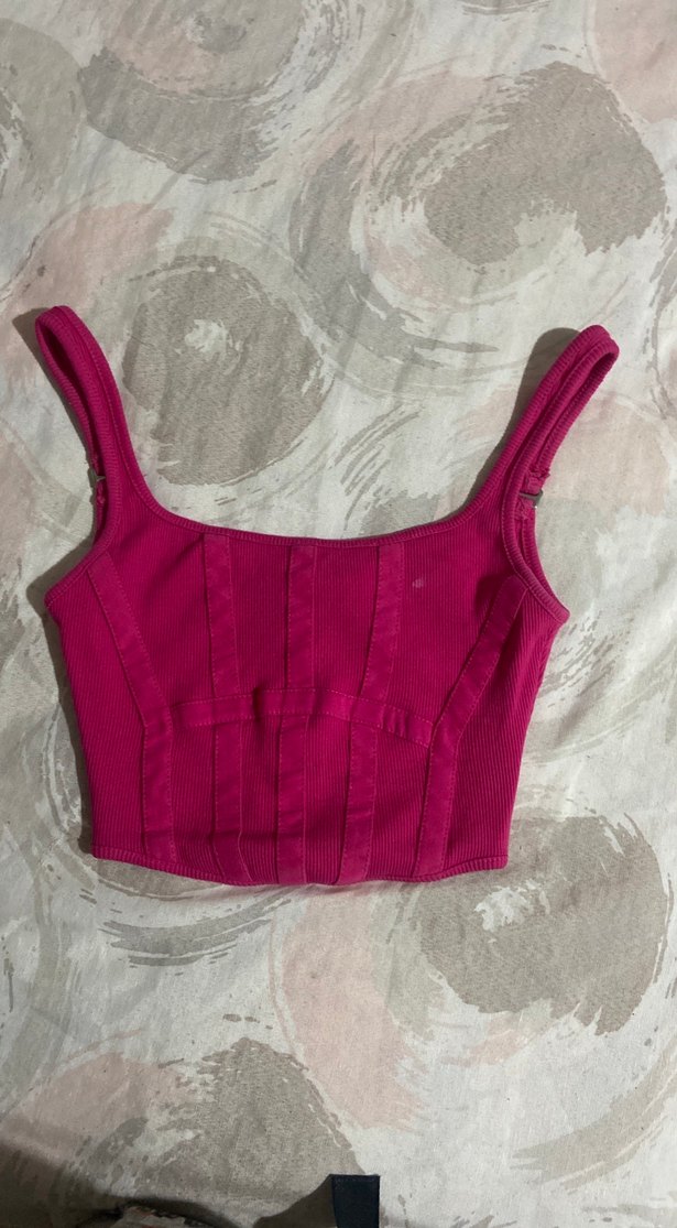 Pembe renkli, sentetik kumaştan yapılmış, pliseli detaylara ve askılı kısa yapıya sahip bustiyer. Spor ve sokak tarzına uygun.