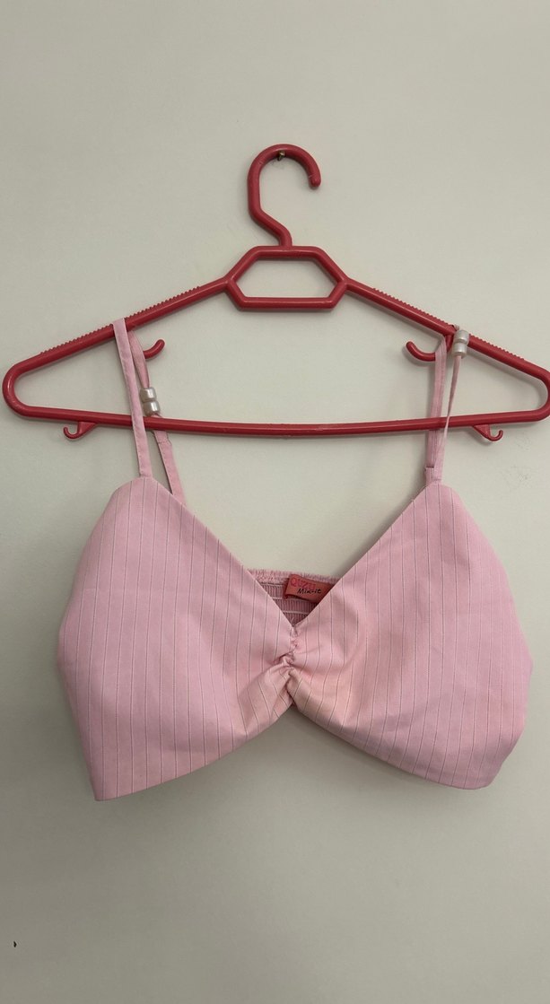 Pembe keten bustiyer, V yakalı ve pliseli detaylara sahip. İp askılı ve kısa kesim, minimalist sokak stili için uygun.