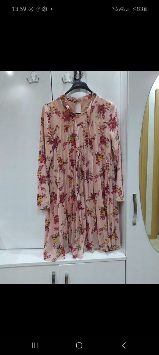 Uzun kollu, bol kesim yüksek yakalı elbise, pliseli tasarım ve pastel pembe çiçekli tie-dye desenine sahip, yumuşak sentetik kumaştan.