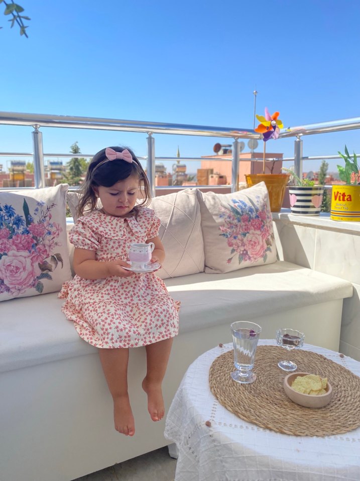 Sadece çekim için kullanıldı. Etiketi üzerinde Kısa pofuduk kollu, V yakalı pembe kız çocuk elbisesi. Pastel tonlarda yumuşak tie-dye deseni ile bohem ve retro tarzda.