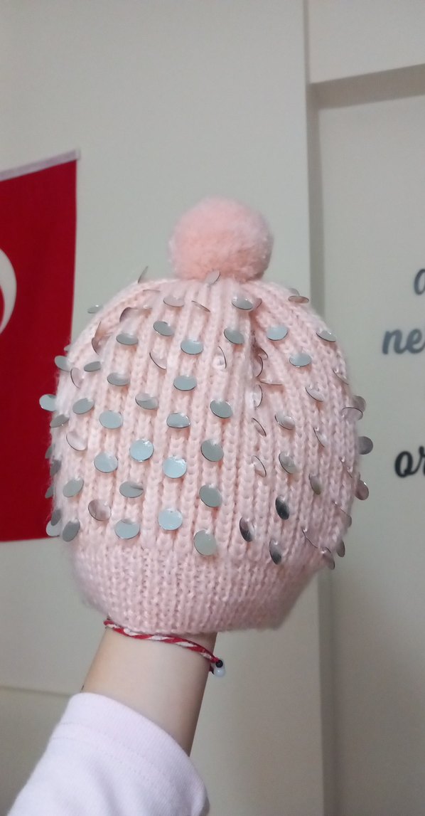 Pembe renkli, yumuşak dokulu kadın beresi, üzeri gümüş çivilerle süslenmiş ve üstünde ponpon bulunuyor, rahatlık ve punk tarzını bir araya getiriyor. el örgüsü sorunsuzz