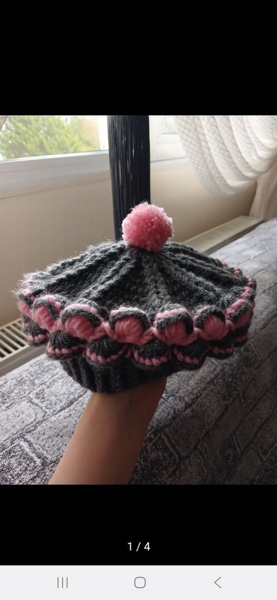 Gri örgü bere, üstte pembe ponpon ve kıvrımlı pembe kenarlarla rahat bir beredir.