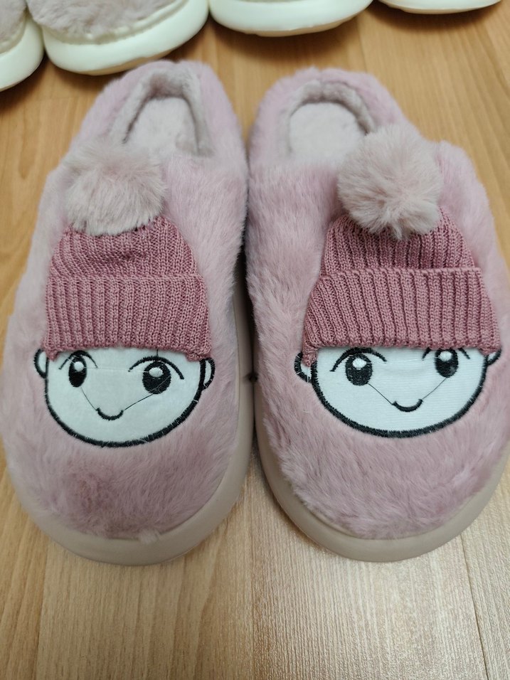 Pembe renkli, nakışlı yüz detaylı ve ponponlu örgü şapka süslemeli, yumuşak tüylü kadın ev terliği. Rahat ve renkli sokak stiliyle uyumlu.