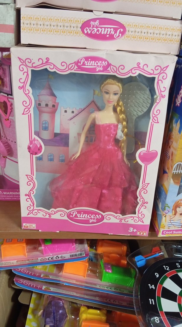Renkli pembe kat kat elbise giymiş, uzun örgülü sarı saçlı prenses bebek. Kutu üzerinde kale resmi bulunur.