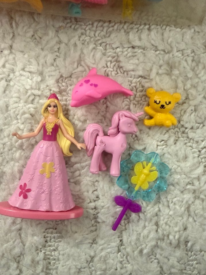 Pastel pembe uzun elbiseli prenses bebek, yanında pembe yunus, pembe tek boynuzlu at, sarı ayıcık ve çiçek şeklinde aksesuar içerir. # oyuncak #kızoyuncak #kızçocuk