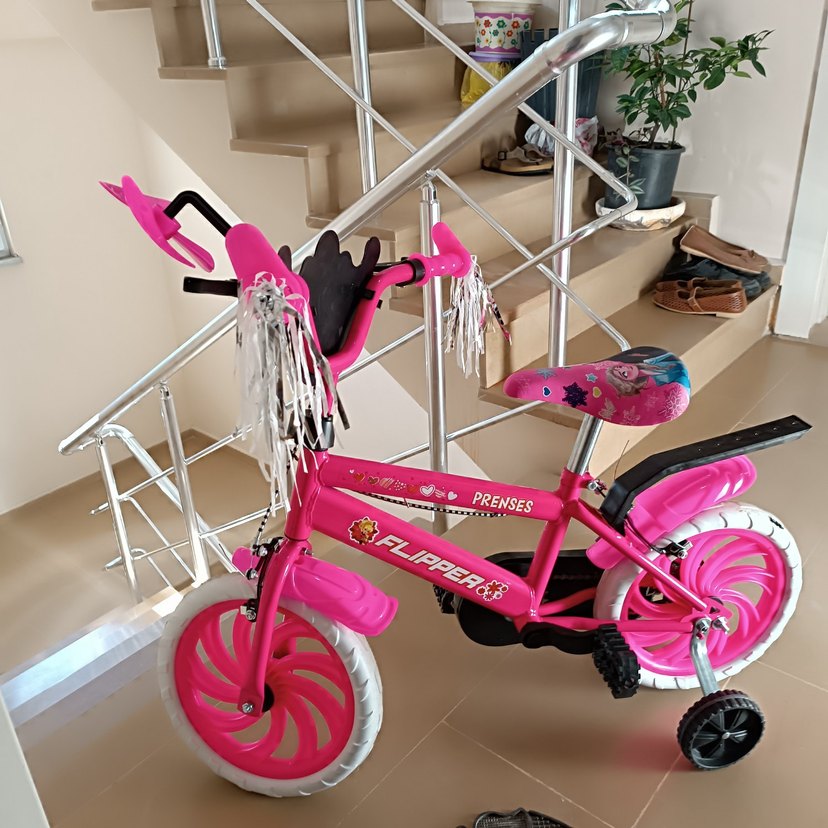 Pembe renkli, 'PRENSES' yazılı çocuk üç tekerlekli bisiklet, renkli detaylara ve süslü gidon püsküllerine sahiptir. bütün aksesuarları mevcut ..hiç kullanılmadı