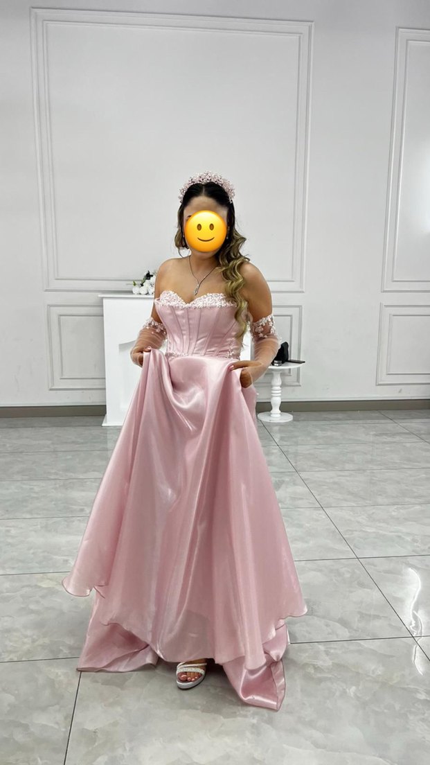 Renk: Pudra pembe Model: Kalp yaka, korseli üst, tül detaylı kolları Kumaş: Saten parlak kumaş Durumu: Sadece 1 kez giyildi / Yeni gibi. Markası: Alfa Beta’dır. Not: Taç fiyata dahildir. Fiyatta yardımcı olunur